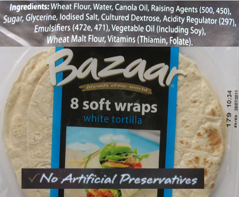 The worst ingredients are the two artificial colours 102 tartrazine and 133 brilliant blue, which are in the herb seasoning! This wrap also contains two preservatives 282 calcium propionate and 200 sorbic acid, known to affect food intolerant children. Then there's the synthetic antioxidant 320 butylatedhydoxyanisole (BHA) which affects many people.