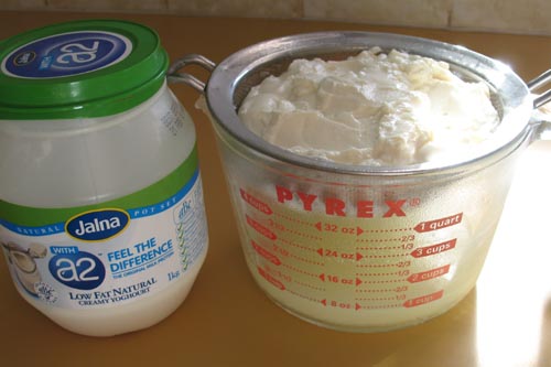 Pour yoghurt into a kitchen strainer and leave to drain overnight over a jug or bowl in the fridge. In the morning, discard the whey that has drained into the jug. The resulting quark in the strainer is thicker and tastes milder than the original yoghurt. It can be used as a spread, a yoghurt-type snack (fresh or frozen) or in a European style baked cheesecake. Does the straining method get rid of amines? It seems to. We welcome feedback (