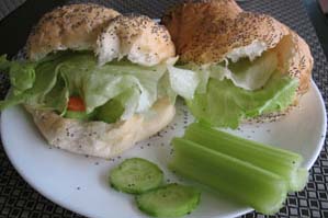 - Lunch: poppyseed buns (Brumby's or Bakers' Delight) with egg and lettuce or cream cheese, cucumber and celery and a little carrot (peeled cucumber and carrot are moderate in salicylates) On previous tours when gluten free, rice cakes not bread.