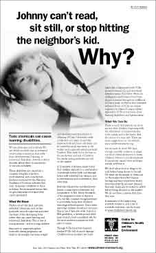 - Here are some shocking public notices run in The New York Times by the Centre for Children's Health and the Environment in the Mount Sinai School of Medicine. To whom are our regulators listening if hospitals have to pay to advertise the harm caused by industrial, food and other chemicals?
